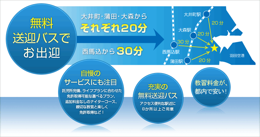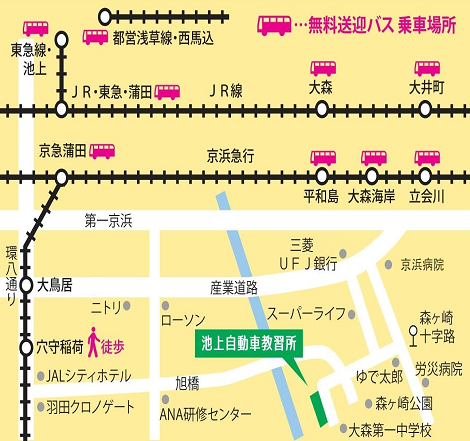 近隣の駅等と池上自動車教習所を結ぶ、便利な無料送迎バスが運行しています。是非ご利用下さい。